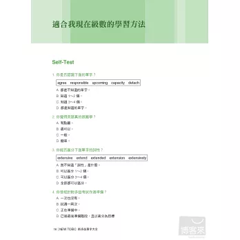 別再傻傻的拿了書就猛K了,在做完本書的「Self-Test 診斷測驗」,請立刻翻到本書的p.18、p.19頁,根據最科學化的評估來選擇最快、最有效率的學習法。