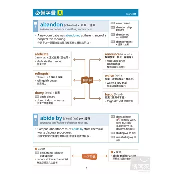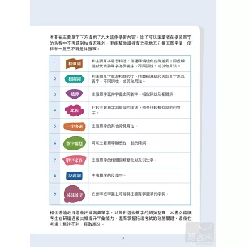 本書在主要單字下方提供了九大延伸學習架構。這除了可以讓讀者在學習單字的過程中不再感到枯燥乏味外,更能讓讀者在不知不覺中充分擴充單字量,使得舉一反三不再是件難事。