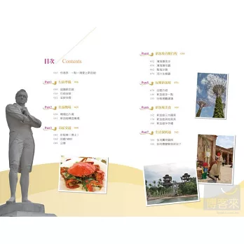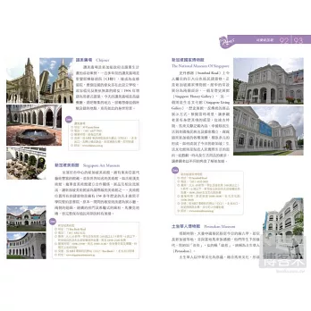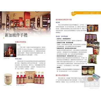 •除了辣椒螃蟹、海南雞飯及肉骨茶等三大國菜外,還介紹內行人才知的巷內美食。詳細整理新加坡當紅的伴手禮,在超市就可搞定,省錢又不失禮。
