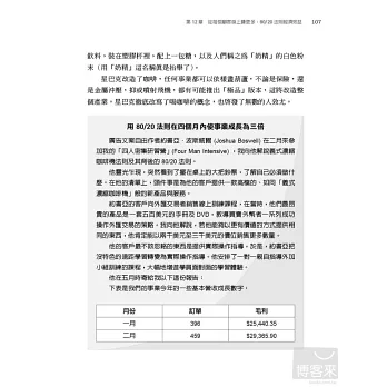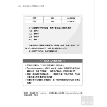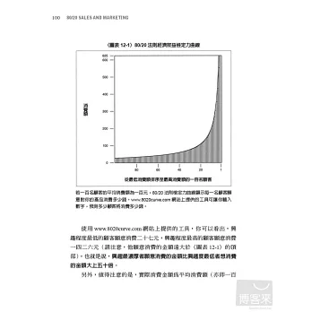 多數結果是由少數原因所致,80/20法則適用所有事物,學會看見它,你就彷彿打開了一個按鈕,看著這個世界由黑白變成彩色。在銷售與行銷上留意80/20法則,你就會聚焦於正確的二○%市場,節省八○%的時間與金錢浪費,從此不會再用「平均值」來看待顧客及產品,懂得從為你最有價值、最熱情的顧客開發產品做起!市場行銷瞬間變得更簡單、容易。