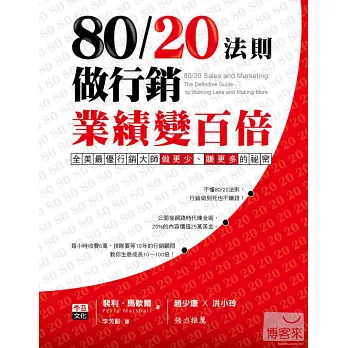 企業界的實務經營管理上,「80/20」法則被廣泛討論,但實際運用並且獲得成效者則還是少數的企業。只要有資源分配的問題,它便派得上用場。它的核心內涵是「花最少力氣,得到最大效果」。作者在本書中闡述的80/20法則指的是:你的80%成果來自於你的20%努力。重點不在於「80/20」這個數字的精確性,而是「什麼是關鍵因素」。也就是重點應放在花心力找出關鍵的20%,然後善用這部分,並將多數資源分配給它運用,就可以做得少而賺得多。作者將其運用在可以想得到的銷售與行銷,從找出關鍵的顧客、測試廣告關鍵字、擴展事業產品線、修改網頁、運用自然力、工作時間投入與市場研究等。 在鑽研「80/20法則」,精進銷售與行銷能力的同時,我想提醒大家:隨著網際網路的興起,「長尾理論」說明99% 產品都有銷售機會,它創造出許多過去被忽視的價值,Google、Amazon 則是長尾代表企業。有人說「長尾理論」打破「80/20法則」鐵律,我認為二者並不衝突,在不同階段或不同目的要思考不同做法。本書作者也提醒何時不能用「80/20法則」,例如要創造成功,永遠會有些事需要做到完美。當我們越熟悉這些法則且善加運用,就更有機會在數位經濟時代創造新的藍海商機! ―洪小玲,遠傳電信網路暨電子商務執行副總經理