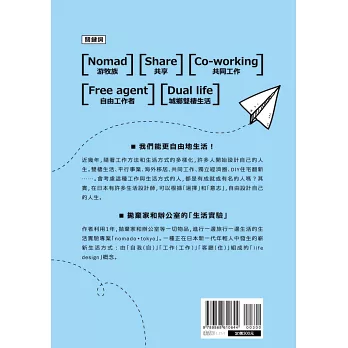 作者利用1年,拋棄家和辦公室等一切物品,進行一邊旅行一邊生活的生活實驗專案「nomado•tokyo」,在過程中遇到許多生活設計師們,看見他們的工作與生活方法。一種正在日本新一代年輕人中發生的嶄新生活方式。作者因此歸納出「自我(自)」「工作(工作)」「客廳(住)」組成的「life design」概念。