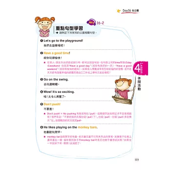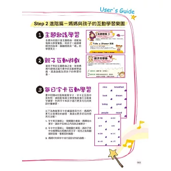 媽媽請先瀏覽所有句子情境,先聆聽一遍MP3,再逐句引導孩子跟著唸。接下來,媽媽和孩子都不要看書,試著隨機進行會話練習。