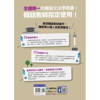 「這本書透過簡單的文法說明、使用例句和豐富的內容,激發了學習韓語的動機。站在一個教語言的教師立場而言,我想說這本書對韓語學習者來說是非常有用的。」━Katie Lloyd,建國大學英語教師