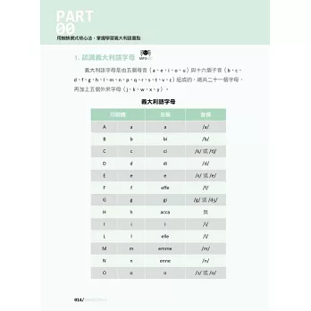 接下來進入最主要的傳統義大利語二十一個字母+五個外來字母學習。在這個單元中,作者除了說明字母的音標外,還標示每一個字母的隸屬音,每個字母皆提供六個單字、六個例句,經由蜘蛛網般的脈絡串聯起來,一線連結一線,結合成綿密的學習網絡,讓你同步學習字母、單字、例句。