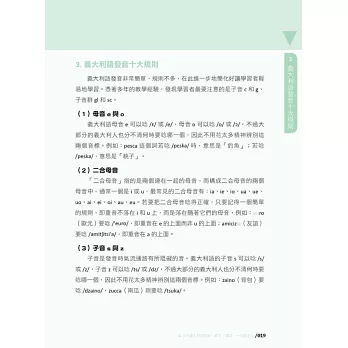 一開始就先說明義大利語的發音十大規則,再搭配發音說明輔助學習,讓你發音好標準!