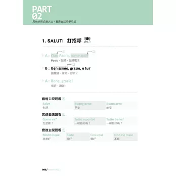 整理出義大利人日常生活中最常用的會話例句,每句皆有中文翻譯,再搭配「套進去說說看」代換補充字彙練習,讓你現學現說好實用!