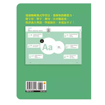 什麼叫做「蜘蛛網式學習法」?所謂的「蜘蛛網式學習法」猶如蜘蛛在吐絲、結網及捕食的型態,一網打盡必須學習的重點!本書就是採用這種方式,從認識義大利語開始,然後逐漸延伸擴散到學習發音、單字、例句及會話等,這種多面向的學習方式,讓你不會在發音學習上裹足不前,而透過串聯的方式,能更廣泛地學習到單字及例句。接下來,就看看本書如何用「蜘蛛網式學習法」,讓你12小時一次搞定義大利語發音、單字、會話!