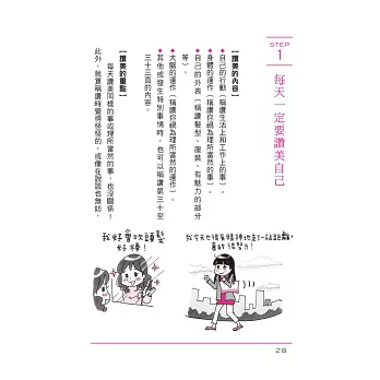 步驟1每天一定要讚美自己。從生活、工作、外表,以往視為理所當然的事,讓大腦習慣讚美的指令,養成讚美的習慣。