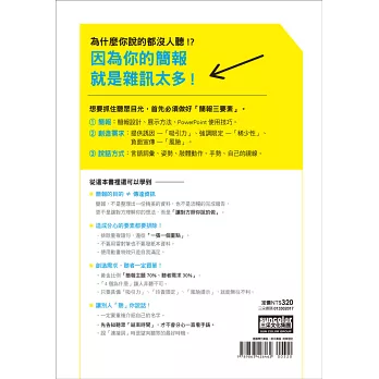 1. 日本第1簡報師的首本著作:一年演講250次、累計聽眾5萬人次、受邀舉辦講座的公司超過200間的豐富簡報經驗,本書一次公開。簡報沒重點又花俏、對方有聽沒有懂,有各種簡報煩惱的人都適用。