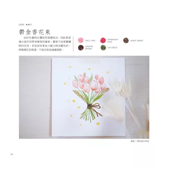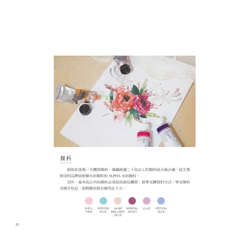 粉嫩的春、熱情的夏、蕭瑟的秋、泠冽的冬,每一個季節都有專屬的顏色,在主要的基調內,搭配出最協調的色彩。每幅畫作都詳細列出使用的顏料,可以作為參考依據,也可以依喜好重新搭配。