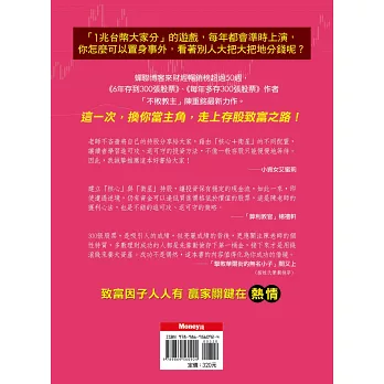 「說完了我的故事,現在要請各位讀者來當一下主角,請你也努力存自己的300張股票。」成功的經驗值得學習,陳重銘連續出版2本財經暢銷著作:《6年存到300張股票》、《每年多存300張股票》,分享他個人20年來辛勤投資股票的心得。這一次,他要教投資人如何打造自己的退休金聚寶盆。