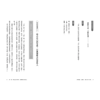 本書擇取《莊子》中深富智慧、極具啟示的段落百句,以貼近現實的視角與深入淺出的文字,闡述莊子精隨。讓讀者在日常中活用經典智慧,輕鬆進入莊子的逍遙世界。