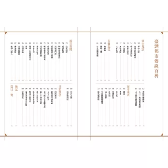 《臺灣都市傳說百科》是臺灣第一本系統性蒐集各類傳說怪談的百科專著。從蒐集故事、追索脈絡,到研究詮釋,取材範圍涵蓋清領時期的地方誌,日治時期的舊文獻,以及媒體資料庫與網路論壇。三位執筆者耗時兩年,爬梳這些傳說怪談的起源與背景、騷動與擴散。全書總計收錄十大類100則台灣的都市傳說,兼具獵奇的想像與理性的趣味,也追索了這塊土地百年來,不同歷史時空下人心擾動的集體記憶。