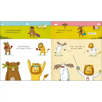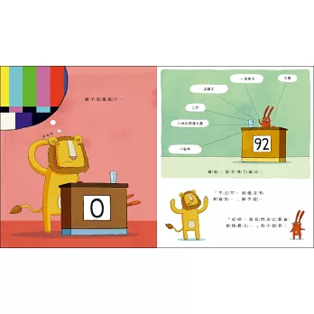看書名就覺得有趣!故事中,小兔子前來挑戰,結果讓大家跌破眼鏡,不論是在藝術,智力或是跳高賽跑……兔子一一擊敗獅子。我問五歲兒子喜不喜歡這本書,他說:「我喜歡,獅子以為他是全世界最厲害的,所以到處欺負別人,不過兔子比他聰明,所以他輸了。聰明才是最厲害的!」我認為獅子得到一個教訓-你不可能永遠都贏,而且團隊合作才是王道!——五歲小孩的媽媽