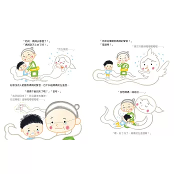 一開始的頁面,突然就單刀直入:「媽媽被車撞到,變成了鬼。」畫面上是媽媽臉上蓋著白布,躺在被子上的臨終場景。從肚子的部位,鑽出了變成鬼的媽媽,臉上帶著驚慌的神色,沒有腳!「哎呀,我死掉了嗎?真是的,我連死了都是個冒失鬼!」媽媽的臺詞顏色較淡,因為已經變成鬼了。
