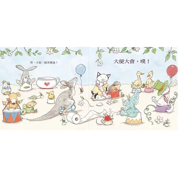 作者莎莉.里歐瓊斯從〈Skip to My Lou〉這首英文童謠發想出這本書的點子,流暢的韻文中充滿無厘頭的好笑句子,再搭配安妮塔.婕朗細膩甜美的水彩畫,讓書裡的角色個個可愛迷人,卻又帶點滑稽感,令小讀者每念一句就忍不住發笑。整本書散發著歡樂的氣息,邀請小寶貝們蹦蹦跳跳,跟著好多種不同的動物,開開心心地加入上廁所的隊伍,一起參加這場熱鬧的「大便大會」。