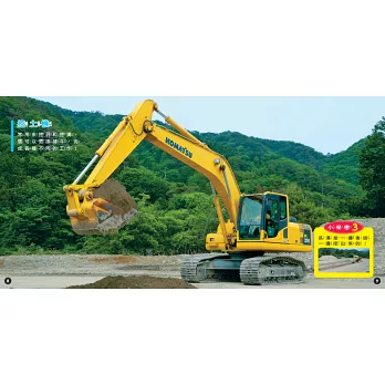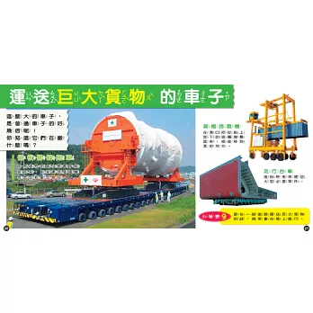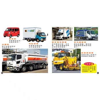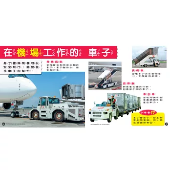 全書依照工作車不同功能與類別,共分成9個章節:有些是在施工現場、消防局、警局、機場工作的車輛;有些是在街上工作、載人的車輛;甚至還有運送貨品、巨型貨物、特殊物品的罕見貨車,種類相當豐富。除了以精緻寫實的照片呈現出不同工作車的獨特外觀,也有說明文字詳述其相關特色與功能,提供更深一層的認識。透過藏在書中各角落的「小祕密」,還可以了解它們不為人知的特殊才能!