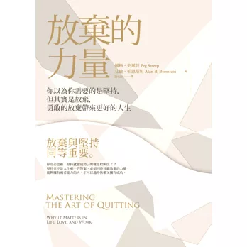 在《放棄的力量》一書中,暢銷作家佩格.史翠普與心理治療師艾倫.柏恩斯坦融合心理學的觀點,告訴我們該如何放棄、要如何重新開始?現代人太容易過度分析、反覆思考,時常困在很多個「萬一」的假想情境中;或者受到「可得性捷思法」、「間歇性增強」等心理影響,繼續堅持錯誤的目標。每個人都需要學習情緒與心理的韌性,進而去了解自己的目標以及何時該堅持,何時該放棄?而不受心理習性所支配,「放棄」是一門讓我們能夠過著幸福與成功生活的藝術。