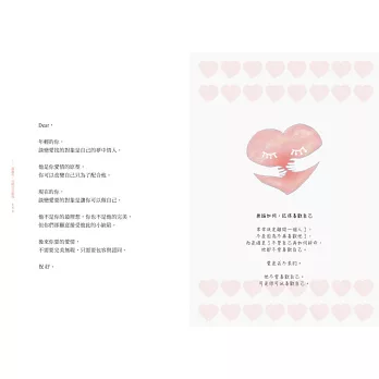 特殊的「愛心釦書籍外衣」裝幀,立體愛心造型,像是一只信封,收藏著相遇的每一個瞬間與心意。每翻開一次書籍,都能再次重溫感動。