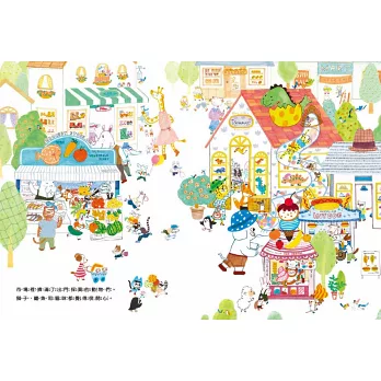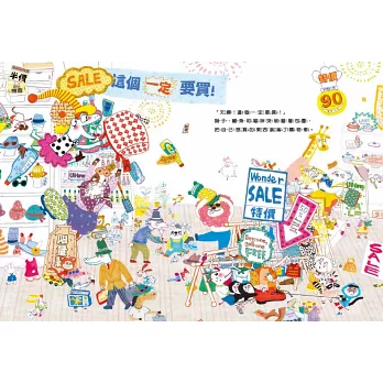 故事開頭,看著一頁又一頁繽紛熱鬧的畫面,讀者們會和主角們一起沉浸在購物的興奮感中,完全忘了一開始去市場的目的,只顧著享受大買特買的過癮滋味……畫面中琳瑯滿目的各式商品、商店裡各有特色的搶購路人,以及藏在各處的小彩蛋劇場 (找一找我們的主角們在哪裡?他們又都在做什麼事?),絕對可以滿足讀者閱讀上的視覺樂趣。