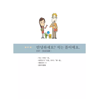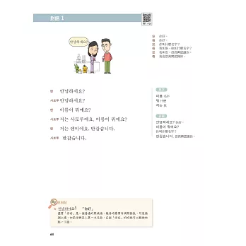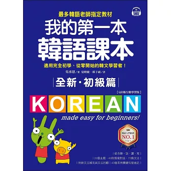 《全新!我的第一本韓語課本》【初級篇:QR碼行動學習版】是一本適合完全零基礎,或已經認識韓語四十音的初級學習者使用的入門教材。課程設計結合了吳承恩老師多年的教學經驗,讓初次接觸韓語的外國學習者可以輕鬆學習。本書涵蓋韓語四十音教學、20個主題、40則情境對話、70條文法,跟著課程架構一步步學習,即使是自學者也能完美消化學習內容。是一本最多韓語老師指定的韓語入門課本。
