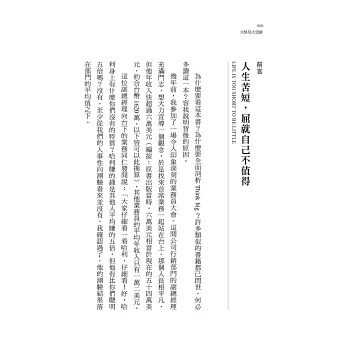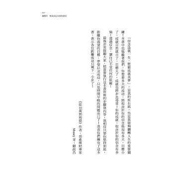 我很認同書中所述人生苦短,屈就自己真的不值得。同樣都要度過這數十載的人生,何不讓自己精彩走過,且華麗轉身呢?——理財Money哥、《從10萬到兩億》作者╱賴政昌