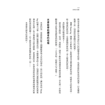 本書每一章都提出數十個實用的技巧與法則,任何人皆可以遵循實踐,突破自我限制,改變思維的方式,有自信地實現自己的目標;最重要的是,將人生掌握在自己手中,獲得自己在人生中想擁有的一切。