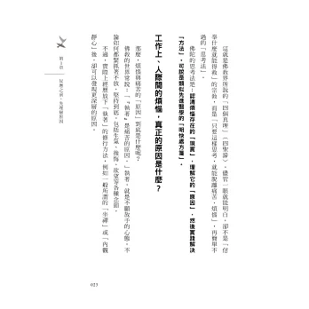 ˙心靈塑造生活。這句話大致說的是心態的重要性。學會掌控認同欲、祈願人們幸福、不對人執著……等心態,將幫助你擺脫痛苦。人們往往會不自覺地被認同欲所囚。透過這本書,作為擺脫痛苦的第一步,首先,我想試著去理解這些感受。
