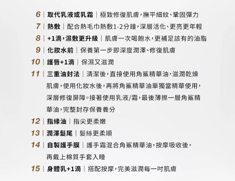 嚴選ECOCERT認證法國頂級植萃角鯊,萃取自法國南部莊園的橄欖,25度恆溫種植,手工親選,每720克橄欖,僅能提取約1克角鯊。透過25道「超微分子冷壓技術」,將油脂細緻化,使成分更精純,更以仿造肌膚原生脂質的高規格打造高親膚、超輕盈質地,能迅速滲透肌膚,不悶、不黏、不致痘。另添加3重珍奢精華油和1重珍稀藻精萃:源自南非山區的有機玫瑰果油,能深層滋潤、撫平細紋並提亮肌膚、液態黃金摩洛哥堅果油、英國有機琉璃苣油和法國黑泊微金藻精粹,僅僅一滴即能將蘊含其中的頂級成分能量發揮至極,能全面修復肌膚屏障,立即改善乾繃、細紋、粗糙,讓肌膚獲得全方位賦活與潤澤,重現柔嫩細緻光澤!