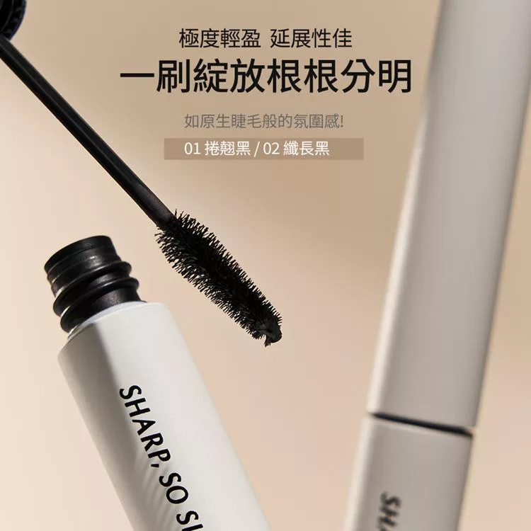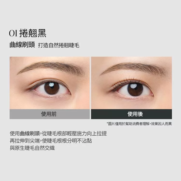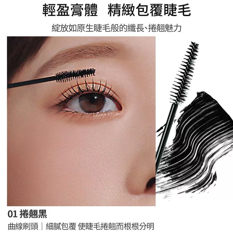 極度輕盈、延展性佳,一刷綻放根根分明、如原生睫毛般的氛圍感! 01捲翹黑: 採長直狀曲線刷頭,細膩包覆,使睫毛根根分明而捲翹。