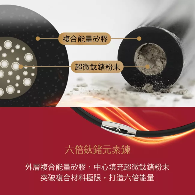手環內含高濃度超微鈦鍺能量粉末,可穩定釋放高達96%的遠紅外線,促進血液循環與新陳代謝。持續配戴消除疲勞,進而達到深層放鬆、舒緩壓力的效果。即使在高壓環境、長時間久坐循環不好、運動過後乳酸堆積,都能感受到身體回復輕鬆的節奏。