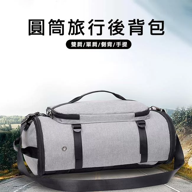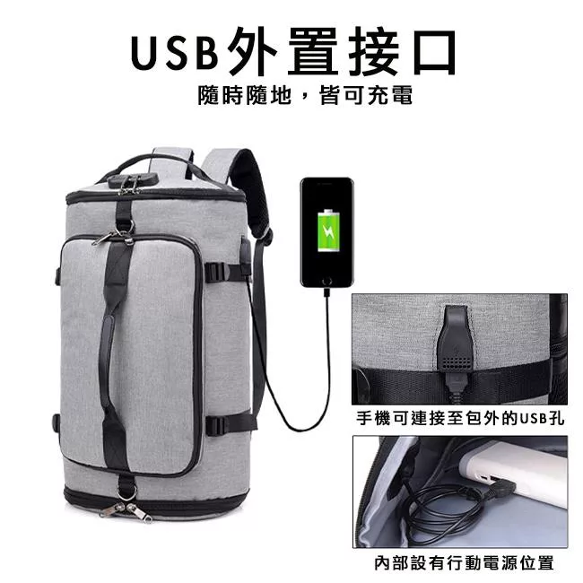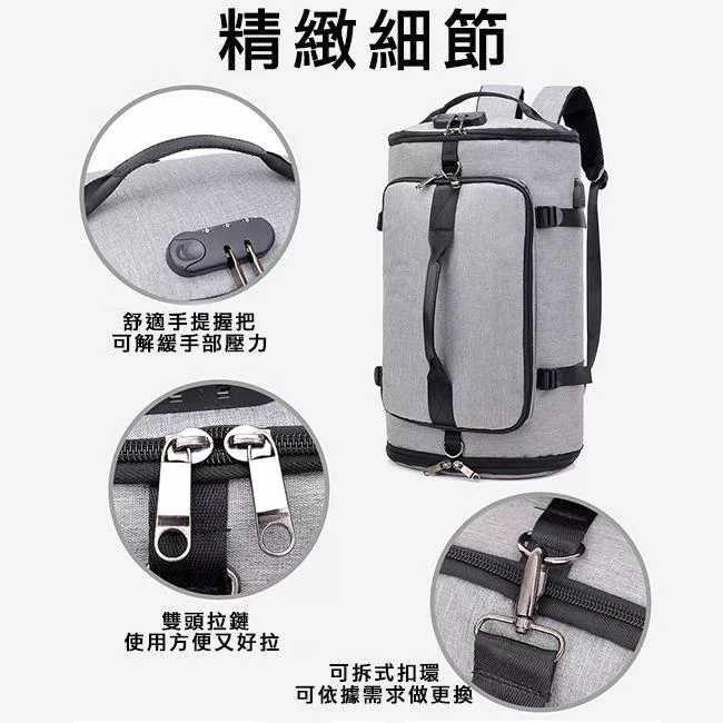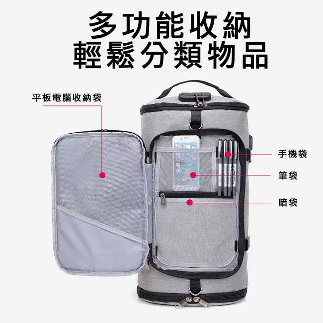 M.E 升級防盜密碼鎖/USB充電可掛行李拉桿雙肩圓筒旅行後背包 灰