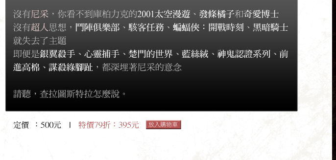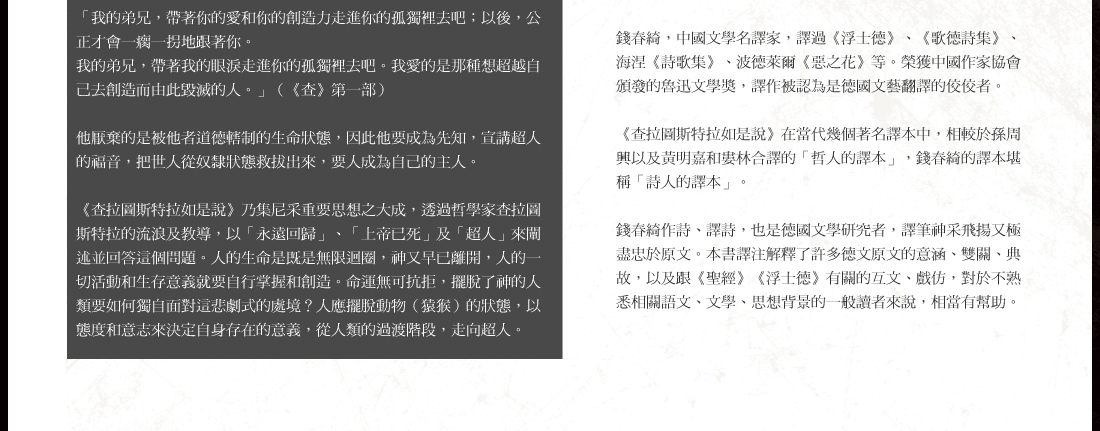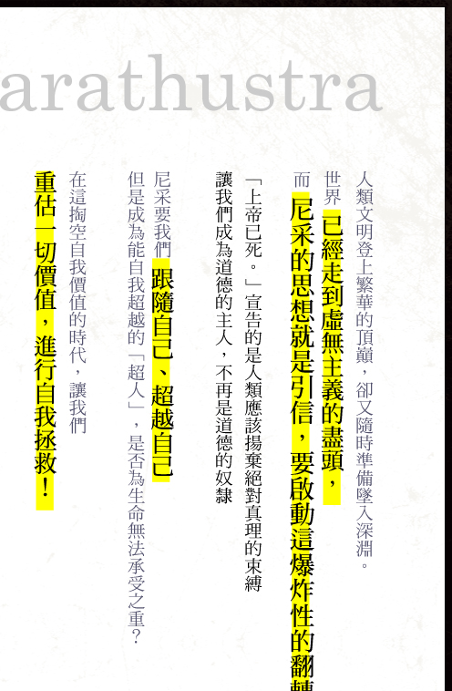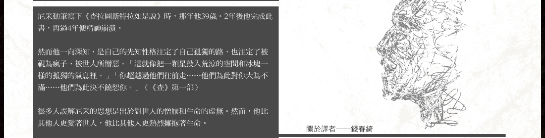 注34把歷史看作超人的生成過程,由這個觀點來認識未來和過去的人的意義。他本人則不惜滅亡而跟現代戰鬥。