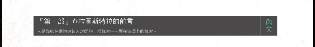 人是聯結在動物與超人之間的一根繩索─────懸在深淵上的繩索。走過去是危險的,在半當中是危險的,回頭看是危險的,戰慄而停步是危險的。人之所以偉大,乃在於他是橋樑而不是目的:人之所以可愛,乃在於他是過渡和沒落。