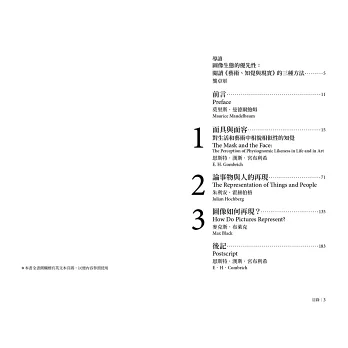 藝術史家、心理學家、哲學家的研究通常各行其道、少有會合,但「藝術再現」這一本質問題卻為這三個領域提供了共同交流的基礎,形成了三篇既相對獨立又彼此關聯的講座文稿,並最終形成本書: