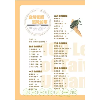 『自然老師沒教的事』篩選出都會與郊區生活均適用的「100堂都會自然課」,按照看得到的月份編排,內容包羅萬象,有動物、植物,也有當季的自然景觀,與學校課堂的授業完全不同,除了自然知識之外,我們更希望藉由精采的攝影與自然插畫,提供一般人容易親近的入門路徑,特別是生活中隨手可得的題材,讓大家願意重新看待大自然,使人人聽得見大自然的心跳。