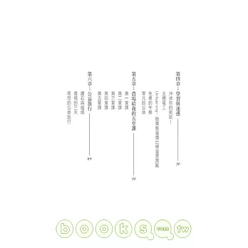 在這個每個人都想當專家、成為權威的時代,他發現在農業中,重視人竟然比技術更重要!一個完全不懂農事的城市人,要怎麼用農業,去感動語言、文化都完全不同的農人?心理學中傾聽的技巧,要怎麼用在傾聽大自然,然後知道如何幫助土地發揮力量?一旦有了一點成果以後,又要如何藉著公益旅行,去感動原本不在乎的人?這些都是學校沒有教的事。