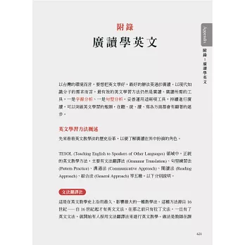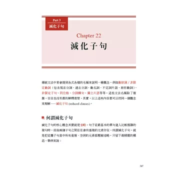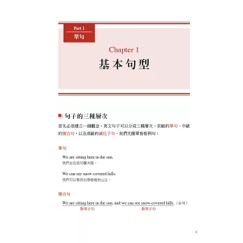 現在,不論你的目的為何──自學、研究所考試、留學檢定、教學備課──我們邀請各位依照全書規劃循序漸進,先認識句子中的基本元素,了解正確的「單句」、再進階到運用及解讀「複合句」,最終能夠獨立寫出語意精確、修辭恰當的「減化子句」。採用本書獨創的觀念,學習文法的過程將會出乎意料地容易,這正是我們最期待能帶給各位的成果。(★欲了解更多本書內容,請參閱作者前言)