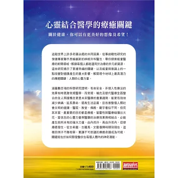 涵蓋數百項的科學研究證明,有些安全、非侵入性療法的效果有時更勝常規醫學,而常規、補充及替代醫療全面整合的全人照護概念更是未來醫療的重要趨勢,能更有效地減少病痛、延長壽命、提高生活品質,並改善整個人類社會文明的健康。醫院、教堂、佛殿、廟宇看似不同,但究其本質,最重要的目的都是療癒。當靈性與醫療碰撞出火花,當信念的心靈力量與醫藥的治療效果兩相結合,必能產生前所未有的強大力量,由內而外,再由外而內,促使療癒發生。從古希臘、古羅馬、文藝復興時期到現在,這樣的例子不勝枚舉。要讓不可思議的療癒奇蹟成為可能,關鍵就在於如何開發蟄伏在每個人體內的神奇潛能。