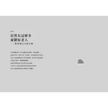 ◎從事基層精神醫療多年,發覺很多民眾對老年憂鬱症的了解都不夠,以致延誤了就醫。真心推薦大家閱讀本書,對家中的長者給予更適切的理解與照顧。——永平身心診所所長 陳亭秀