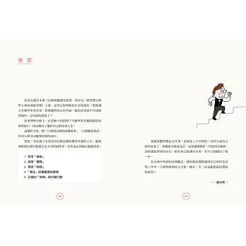 而彼得.杜拉克一生中最重要的思想和哲學,用故事和插畫的方式,圖文並茂的呈現在讀者眼前,深入淺出的解開管理學中看似困惑難解的問題,轉化成一本跨越年齡層的管理學圖文書,同時讓大小讀者明白:其實成功從來不遠,只要轉換幾個簡單的想法和行動,必能打破眼前讓人煩惱的僵局。