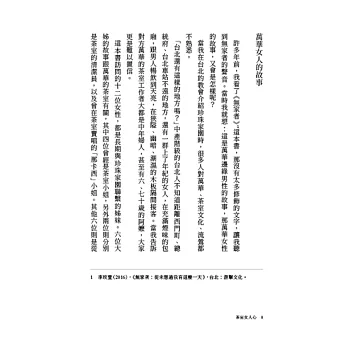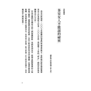 作者的文字將帶你拉近茶室內,在那些被社會忽視、漠視和歧視的女性中,挖掘出真實的台灣女人命運和選擇,由她們訴說自己的人生與無奈、應對交陪和身體勞動,並且從她們的生命故事中,看見一個個台灣女人的人生、壓迫、無奈和愛,及那些僅有的選擇。—林立青(作家)
