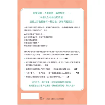 無論是多難以啟齒的問題,上野教授都能切入深處的痛點,予以犀利卻正向友善的回答。──諶淑婷,文字工作者