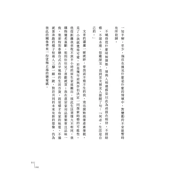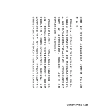 沿著字把我以為「都沒事了」的心敞開了,哭也是自然,為什麼需要散文呢,總是有些積存在眉頭裡的事情,從來沒被打開來……激不起波濤的討論在這本書裡,有了那種近代攝影很流行的微距鏡頭拍出來的紋理,看個仔細便會很漂亮。──劉秝緁/編輯