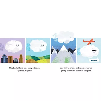 本書作者羅伯.哈吉森將自然現象擬人呈現,化身為一朵名叫「小雲」的雲朵。小雲喜歡旅遊、愛交朋友;擁有快樂的情緒、也有苦不堪言快爆炸的時候,這樣的一朵雲就如同孩子身邊的玩伴,親切又熟悉的帶領孩子以雲朵視角出發,彷彿乘上一朵雲,隨之飄浮、下沉:一會兒寒冷結冰降下雪花、一會兒環繞山間形成濃霧,偶爾還被小水滴塞滿,索性來一場歡聲雷動的大暴雨!