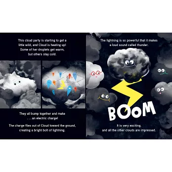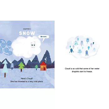 本書包含簡潔又有趣的九個章節,囊括了日常生活常見的天氣成因。跟隨有著一雙晶亮大眼的小雲飄浮世界各地,在不同樣態的轉換中,輕鬆認識複雜的氣象科學:霧氣、雪花還有雷陣雨,都是小雲生命歷程的珍貴點滴!