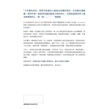 我們總被一個無形的社會框架所教導,「玩」聽起來好像總是帶了那麼點負面成分,直到我看了這本書,才頓時醍醐灌頂,重新認知了「遊戲」與「玩心」在我們的日常思考中,是多麼重要又時常缺席的觀念,它們不僅能作為設計上重要的思想進路,更是人人能夠應用在生活中的思考精神。——林呈軒(二棲設計創辦人)