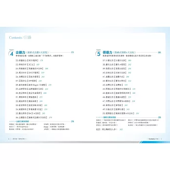※〔隨書附50技術╳ 36角色學習索引表〕完整提供50個技法(由思考、溝通、銷售、企劃、領導等職場五力展開),對應36個角色(由主管、銷售、企劃、服務、工程、幕僚、支援、專業、一般等九大類展開),以利讀者迅速切入跟自己最相關的學習。