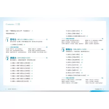 50個專業技術介紹方式為:技術、一句訣、工具、目的、說明、案例、心法。內容經過精心編寫整理,結合心智圖,以流程、版型、模組的方式呈現,除了方便讀者信手可用之外,也有利於企業迅速導入,進而產生績效。